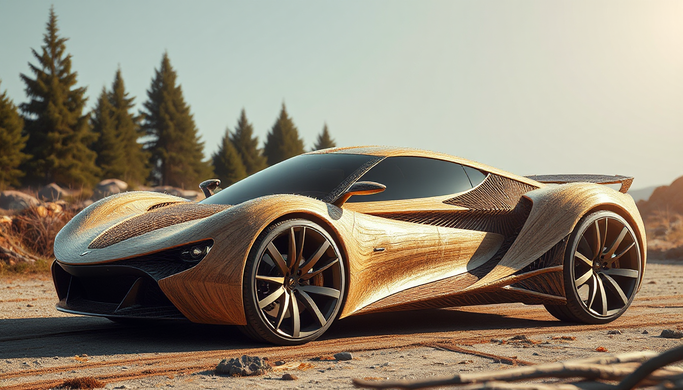 masterpiece of photography, dyanimic framing, an incredible image,A sleek and aerodynamic vehicle crafted entirely from the finest pine needles and sturdy oak wood, its exterior gleaming with an organic sheen, the bark subtly blending into the design, creating a harmonious fusion of nature and engineering.,
