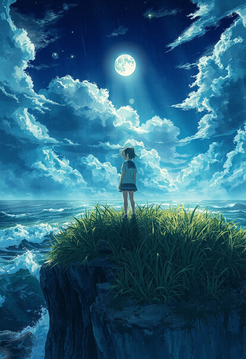 Vertical 9:16 cinematic anime scene, ultra-detailed 4K, in the style of “Weathering with You” key art: a lone girl in a soaked school uniform standing atop a grassy cliff plateau; knee-high grasses bend in the storm breeze; below, dark ocean waves crash against rocks; moonlight breaks through drifting clouds, creating dramatic light shafts; feenstaub dust motes sparkle in the shafts of light; layered cloud banks recede into depth; parallax-ready composition with grass blades crisp foreground, girl in sharp midground, foam-tipped waves and horizon softly blurred; hyper-detailed watercolor cel shading, wet cliff textures, subtle bloom and film grain; powerful, enchanted sense of depth and motion