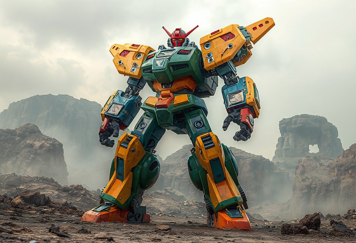 "Create a vibrant and dynamic image of the Ironhammer the Giant, a mecha standing majestically against a backdrop of the Contaminated Earth. The Ironhammer the Giant boasts a body of green and yellow, with contrasting blue and orange arms and legs, and a striking red head. Capture the mecha in motion with a well-timed snapshot of a dynamic pose, full of potential movement. The image should be 4K, with exceptional quality, lifelike details, and vivid emotions. Utilize striking colors, impeccable composition, captivating lighting, and a creative angle to bring the Ironhammer the Giant to life. High-quality scan from Artstation, 8k."
