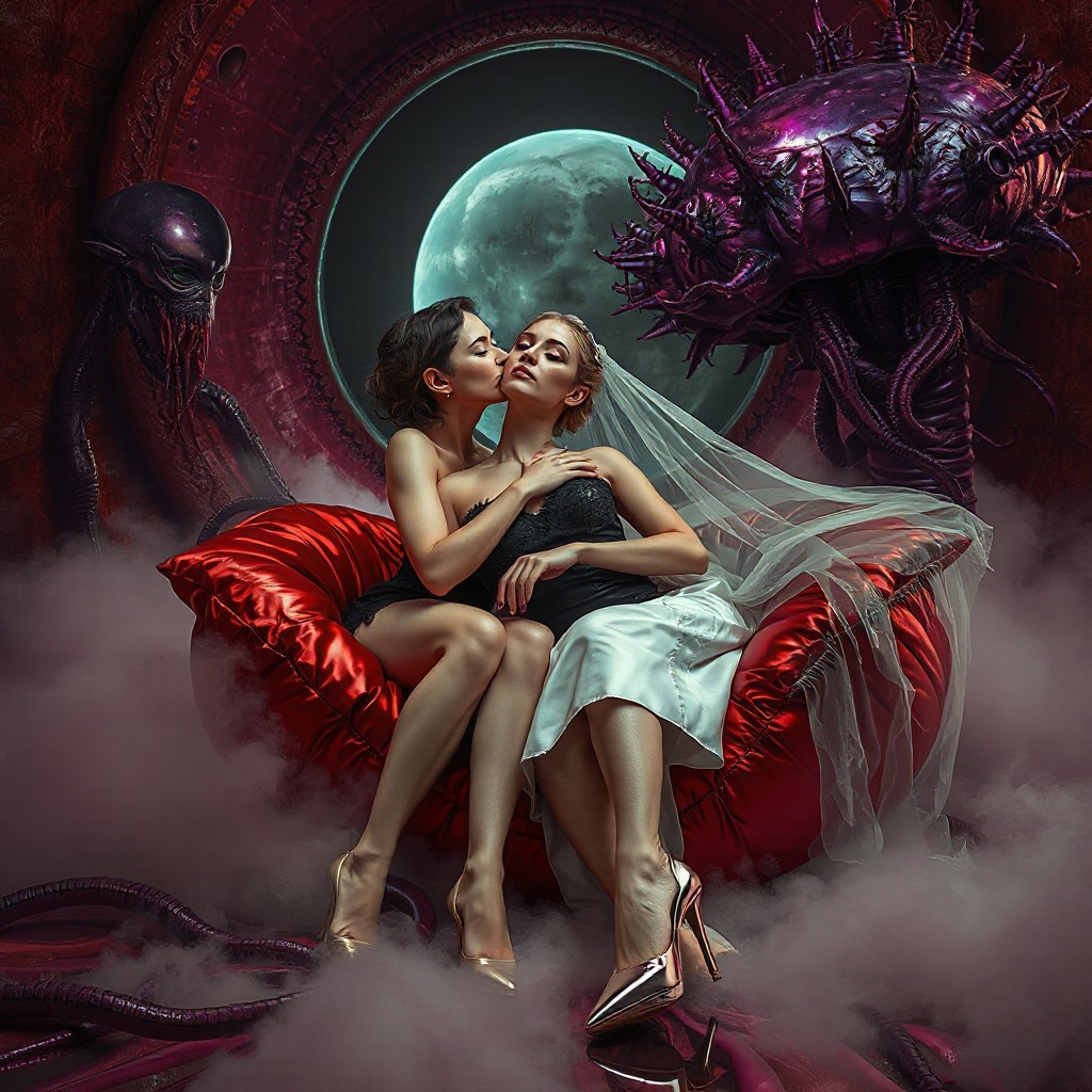 tree ladies, two sultry slender norvegian ladies in a whorish black lace camisole kissing and fingering from left and right struggling luxurious young bride, wearing glossy high heels, entangled in long tentacles, reclined in weird red foil pillows, covered with giant ultrathin transparent slime veils, surrounded by aliens, giant portal to outer space, fog from the floor, giant purple alien carnivorous flower with glossy spiked petals at background, weird alien hive slime walls and fleshy floor, horror, reminiscent of H.R. Giger, Zdzisław Beksinski, and Ash Thorp's dark, sleek styles, with close-up glamour photography, glossy satin and silver heels glistening, fleshy slime dripping, and dark shadows.