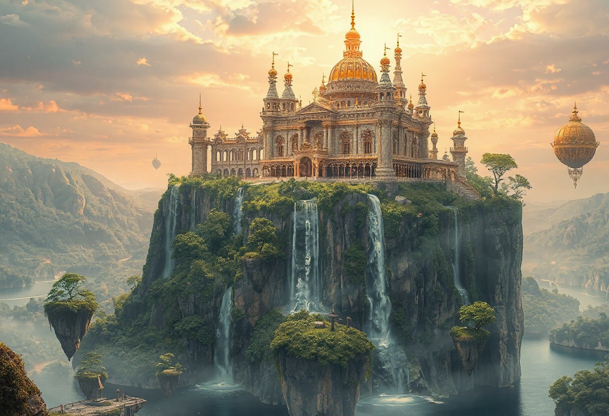 A breathtaking palace sits atop the tallest floating island peak, overlooking a vast, lake forest. The architecture is grand, with towering spires, intricate gold and marble details, and cascading waterfalls flowing down the cliffs. The sky glows with a soft, ethereal light, adding a dreamlike atmosphere. Floating islands drift nearby, adding to the fantasy setting. The palace radiates majesty, appearing both ancient and timeless.