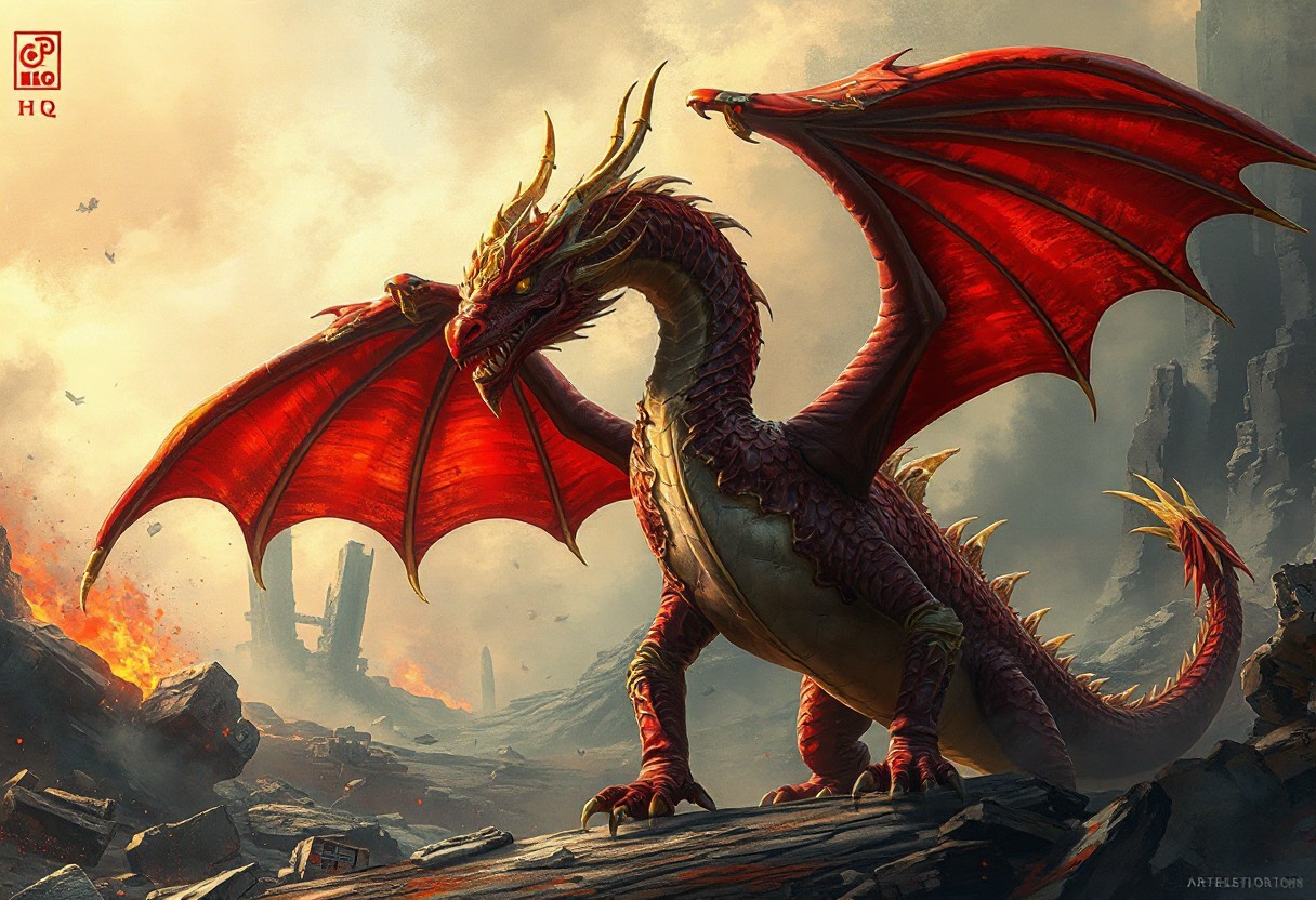 "Create a stunning, detailed image of a Black Rose Dragon, standing proudly against a backdrop of blasted ruins. The dragon, primarily red with gold accents, has spread wings, a fierce yet elegant appearance, and is adorned with intricate, lifelike details. Utilize 4K resolution, exceptional quality, and vivid, harmonious colors to emphasize the dynamic action pose and captivating lighting. Include design elements such as sharp lines, brush strokes, and splash ink illustrations. Highlight the eyes, face, and clothes with meticulous attention, creating a handcrafted, high-definition piece that embodies cinematic lighting, Raphael style, and Houdini aesthetics. Aim for a joyful impact, powerful message, and trending status on Artstation, HQ."