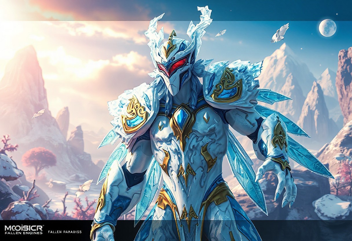 "Explore the dynamic and intricate details of a Frost Monarch, Mobius, standing ready for action amidst a stunning Fallen Paradise backdrop. Adorned with vibrant blue and gold accents against a predominantly white body, the Monarch's red visor adds a striking contrast. The lifelike details and vivid emotions are enhanced with sharp lines, harmonious colors, and a captivating dynamic pose. This stunning matte painting boasts impeccable composition, a well-timed moment, and intentional focus. Found trending on ArtstationHQ, CGSociety, and Behance, this highly detailed 8K masterpiece is a testament to the artist's skill with Octane Render, Unreal Engine 5, and Raphael Style techniques."