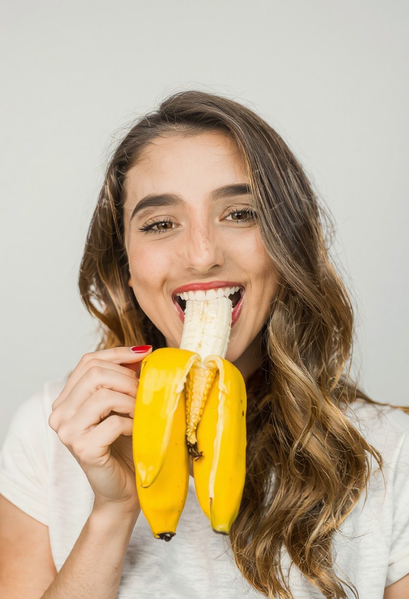 beautiful woman eating a half-peeled banana, mouth closed around banana stalk, banana held in her hand, banana peel moved down to midway, woman delighted.