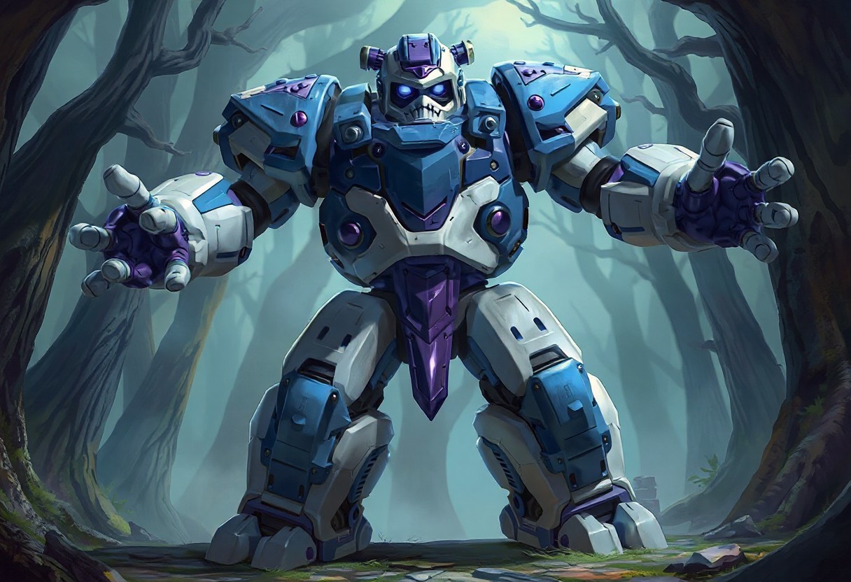 The image features a detailed, full-body view of a Gear Golem the Moving Fortress, standing in a dynamic pose with arms outstretched. The Gear Golem the Moving Fortress showcases a blue and white color scheme with purple and black accents, giving it a futuristic appearance. The background is a epic Erosion Hand Forest, allowing the rGear Golem the Moving Fortress's vibrant colors to pop. The image is expertly composed, with a focus on the Gear Golem the Moving Fortress's intricate design and lifelike details, including its expressive eyes and detailed clothing. The quality is exceptional, boasting sharp lines, harmonious colors, and vivid emotions, making it a stunning and captivating piece of art.