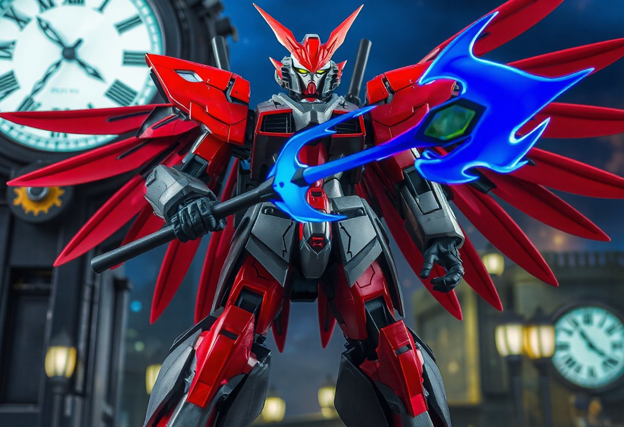a Garuda the Wind Spirit mecha standing proudly against a Clockwork Night background. The mecha, mostly red and gray, boasts black arms and legs, holding a blue Fire Whip. Its head bears a red visor, and it's prepared for action in a dynamic pose. This 4K image showcases exceptional quality, vivid colors, and impressive details, from intricate facial features to well-crafted clothes. The image captures the mecha's powerful presence, demonstrating expert technique and creative composition.