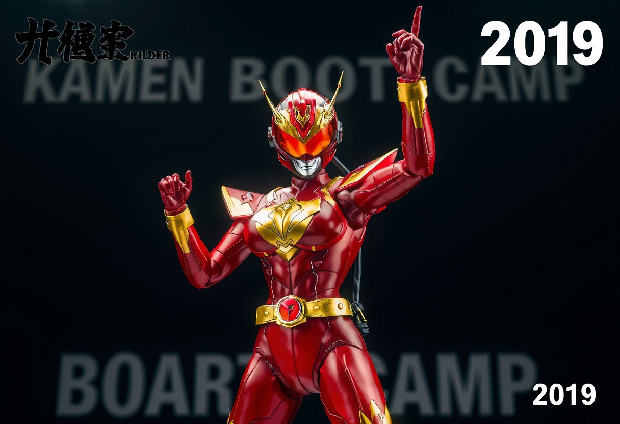 Center stage stands the Cyber Angel woman Dakini, vibrant in red and gold, poised for action with one arm uplifted. Her helmet, bearing a red visor and gold emblem, matches the striking color scheme. The backdrop, Bear's Boot Camp, provides a stark contrast. Top left, "Kamen Rider" is inscribed, while the bottom right corner reads "2019". The figurine, in high resolution, is the focal point, exuding energy and movement with its dynamic pose. The contrasting colors, text, and background offer context and intrigue. The image is a celebration of the character and anime, enhanced with vivid emotions, sharp details, and captivating lighting.