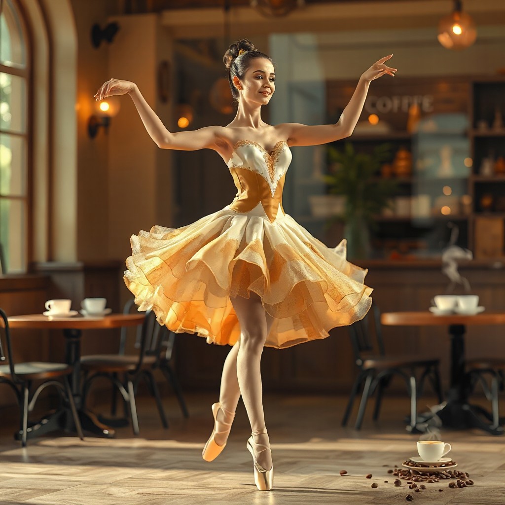 Create an image of a ballerina performing a graceful caruchino dance. The ballerina is dressed in a unique costume made of coffee foam, which looks like a light and airy cloud. The costume should have gold, cream and gold, imitating the texture and color of coffee with milk. The background shows a cozy coffee shop with soft lighting, tables and chairs are visible. There are cups of coffee and desserts on the tables, creating a cozy atmosphere. You can add coffee—related elements around the ballerina, such as coffee beans or steam rising from cups. The ballerina looks elegant and confident, with graceful movements of her arms and legs. The lighting should be warm and soft, with the addition of the texture of the costume and the atmosphere of the dishes." This software can be used to generate images in various graphic editors or AI image generators.