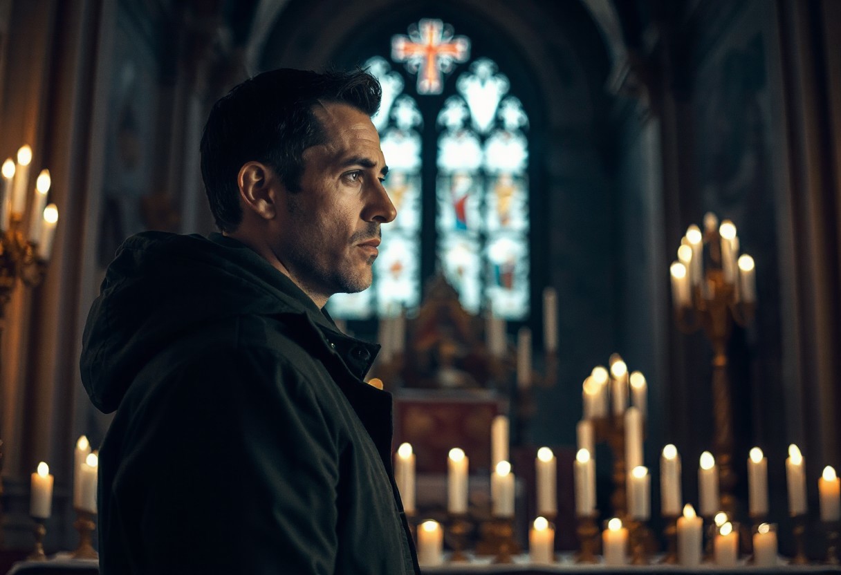 professional photo, side view photo of Caucasian man in front of an altar covered with candles, wearing a dark green parka, serious face, dark features, dramatic lighting, in a dim cathedral interior, lit by candles