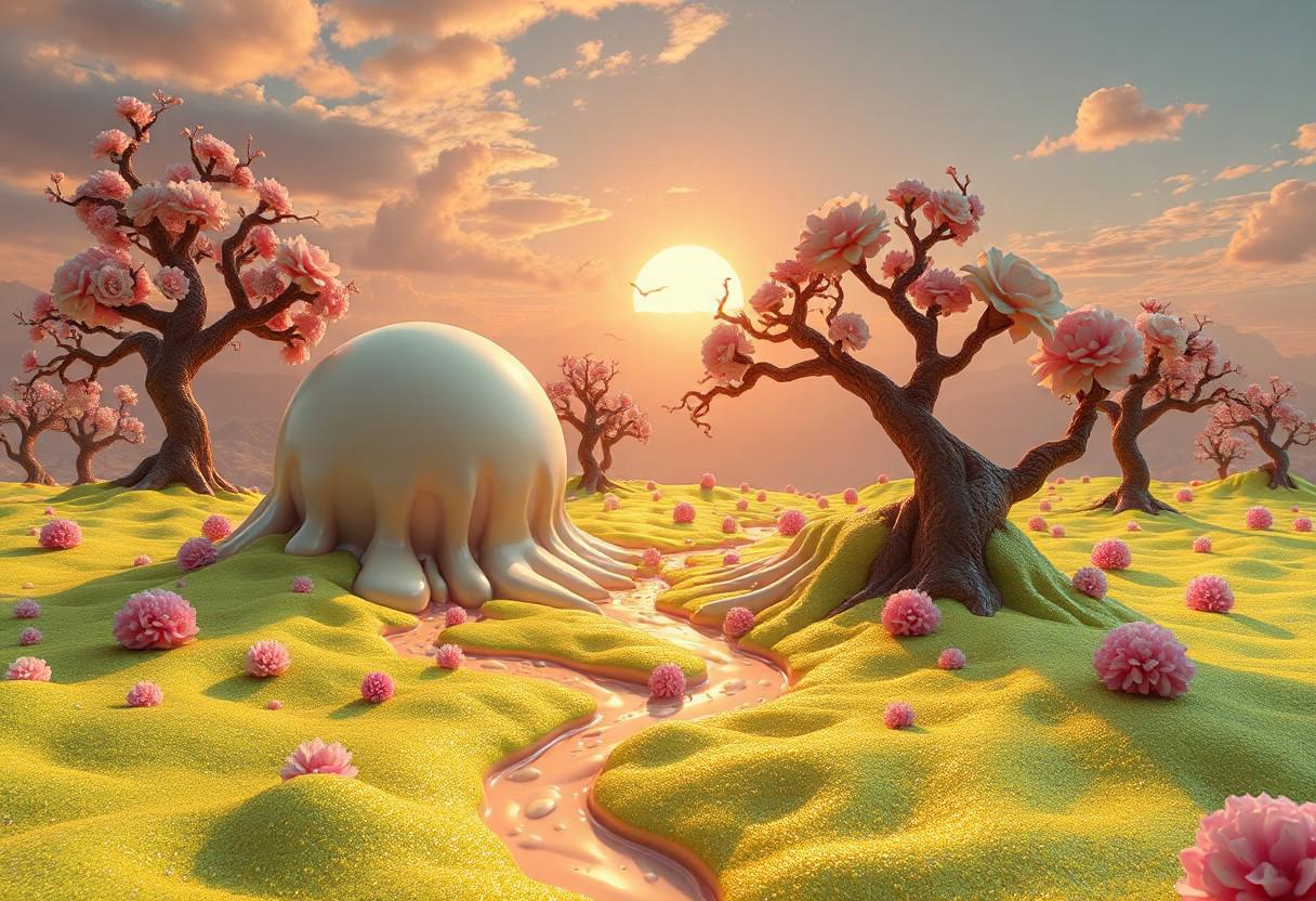 A wild, surreal fantasy landscape entirely composed of mouthwatering desserts, yet infused with a bizarre sensuality. 2 round, Breast-shaped mountains of ice cream, shining under the golden glow of an eternal sunset, drip rivers of creamy milk cascading into pools below. The ground is covered in vibrant, glistening green velvet fields, impossibly soft and shimmering as if woven from edible silk. Jiggly, butt-shaped jello slimes in shades of pink, peach, and caramel bounce playfully across the terrain, their perfectly rounded forms rippling with every movement. Towering chocolate waffle trees stretch toward the candy-colored sky, their twisted branches heavy with lush, nectar-dripping flowers resembling intimate, fleshy folds, exuding the thick, golden sweetness of honey. The air is thick with an intoxicating blend of warm vanilla, rich cocoa, and fermented fruit, an overwhelming sensory overload. Hyper-realistic yet dreamlike, ultra-detailed 8K, overflowing with indulgent textures, erotic surrealism, and chaotic divine beauty. The key elements in the image are draw along a Fibonacci spiral. High Depth of field, dynamic reflections, 4k hyper details, super aesthetic, masterpiece, ray tracing, ambient occlusion. hyper-detailed rendering, high resolution, perfect anatomy, NSFW.