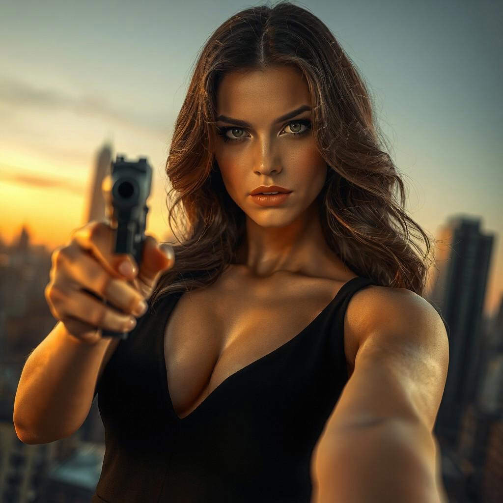 The image is a high-quality, digitally created CGI scene with a cinematic vibe, featuring a woman with long, wavy brown hair and fair skin. She's in a black dress with a plunging neckline, giving off a sultry vibe. The woman is holding a handgun in her right hand, aimed directly at the camera, suggesting a moment of tension or confrontation. Her expression is serious, with slightly parted lips and narrowed eyes, adding to the intensity of the scene. The background showcases a cityscape at dusk, with tall buildings and a skyline that's blurred to focus attention on the woman. The lighting is soft, with natural light coming from the setting sun, casting a warm, golden hue over everything. The color palette includes shades of brown, gold, and black, which complements the dramatic mood. The camera angle is slightly low, making the woman appear more dominant and powerful. The composition follows the rule of thirds, with the woman's face and gun positioned along the intersecting lines, creating a balanced yet dynamic shot. The depth of field is shallow, keeping the woman in sharp focus while the background remains blurred, enhancing the sense of depth. The subjective aesthetic quality of the image is very high, with professional-grade CGI effects and a polished look. The image likely uses a mix of artificial lighting for the woman and natural lighting for the cityscape, creating a harmonious and visually appealing scene.