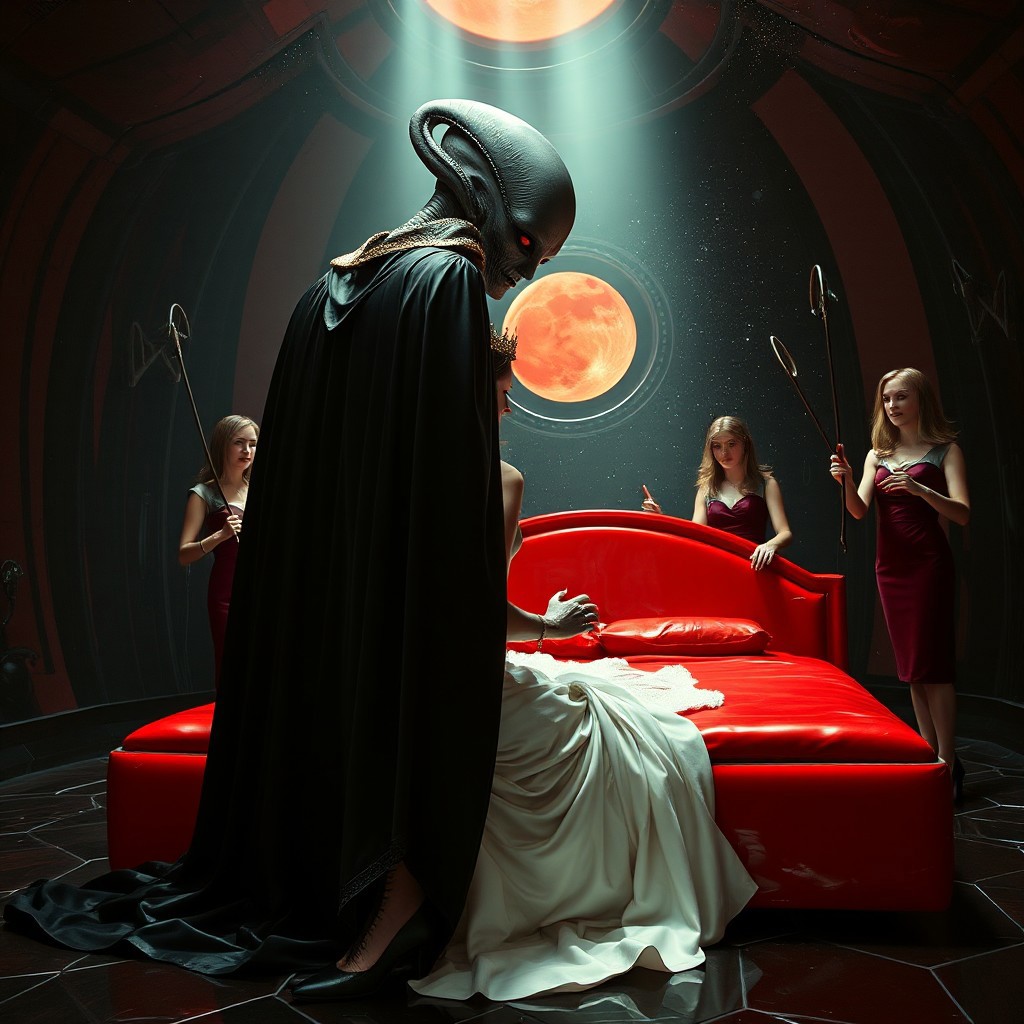high-society elegant slender norvegian rich innocent young bride kneeling whorish red glossy bed from behind. She is ensnared by a towering, gray human-like alien, draped in a long, glossy black cloak, its eyes gleaming red with an otherworldly intensity. its hands touching her head putting slime tentacles tiara on her. Encased in light beam from the alien breeding chamber celling. Surrounded by strict ladies wearing glossy satin dominatrix attire and glossy high heels, holding whips. weird wet-look black slime walls and floor, colossus observation blister to outer space full of stars, bright red moon, vintage-inspired makeup, long hairs, ultra thin waist, evil grin, porcelain skin, lipstick, red nails, in the style of a haunting, retro-futuristic 1950s sci-fi nightmare, horror, alien space base,,