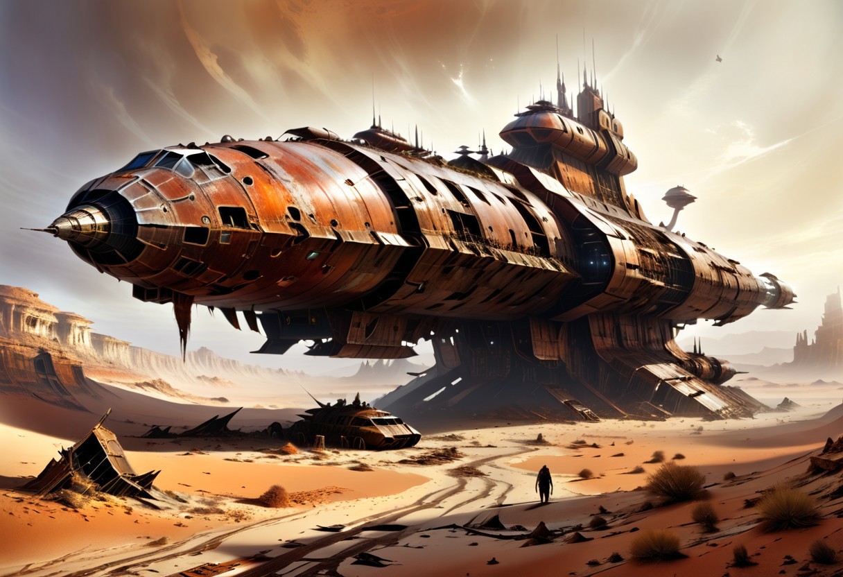 masterpiece,best quality,absurdres,dvr-rst, Huge abandoned decaying spaceship in a desert landscape, Decay, surreal, beautiful, haunting,