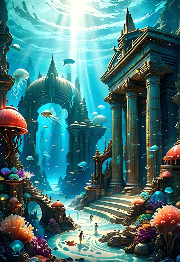 An awe-inspiring underwater metropolis of Atlantis, bathed in ethereal luminescence, where prismatic coral gardens weave through crystalline palaces and gravity-defying bridges sculpted from iridescent pearl strands. Bioluminescent jellyfish drift like celestial lanterns, illuminating bustling streets where merfolk adorned in flowing garments exchange treasures and whispered tales. Grand amphitheaters resonate with harmonious waves of song, their melodies shaping the very currents. Ancient leviathans glide in graceful reverence as whimsical spirit fish leave dazzling trails of energy. The atmosphere ripples with liquid silk, shifting between sapphire, turquoise, and molten gold as Atlantean magic dances through the waters. A celestial ritual unfolds beneath shimmering constellations—a dreamlike spectacle captured in ultra-detailed, cinematic watercolor strokes, exuding motion, wonder, and breathtaking surrealism.