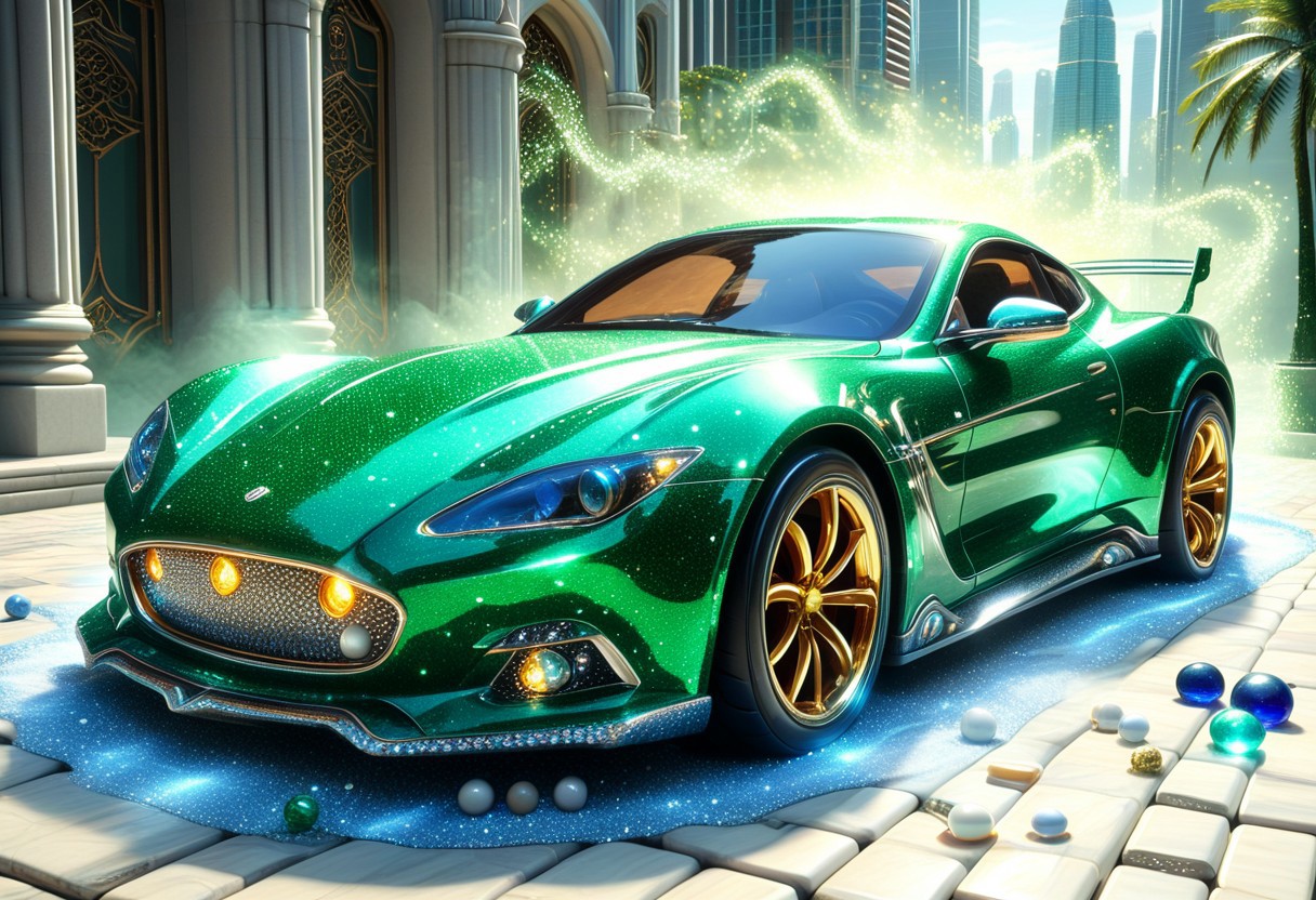 vibrant colors, shiny_skin, prefect lighting, detailed image, snoozing, masterpiece, best quality, highly detailed, ultra quality, hkmagic, sparkling glitter and crystals, glowing emerald light waves, in a fantasy art style, Sports car made of marbles, city, skyscraper, building, sciencefiction, day, sunlight,
