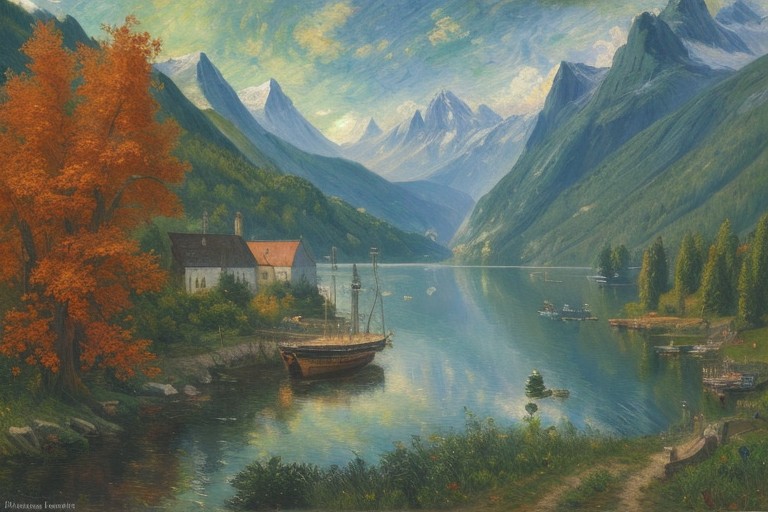 (industrialism:1.1), (impressionism:1), scene painting, a painting, Fjord ,Forest ,
