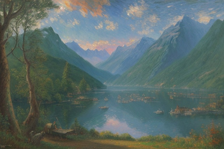 (industrialism:1.1), (impressionism:1), scene painting, a painting, Fjord ,Forest ,