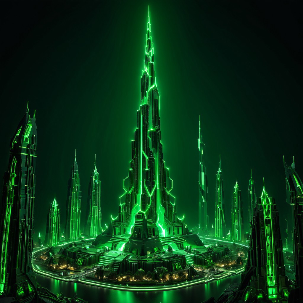 masterpiece, best quality, amazing quality, very aesthetic, electricity, green glow, green theme, The Burj Khalifa in necron style