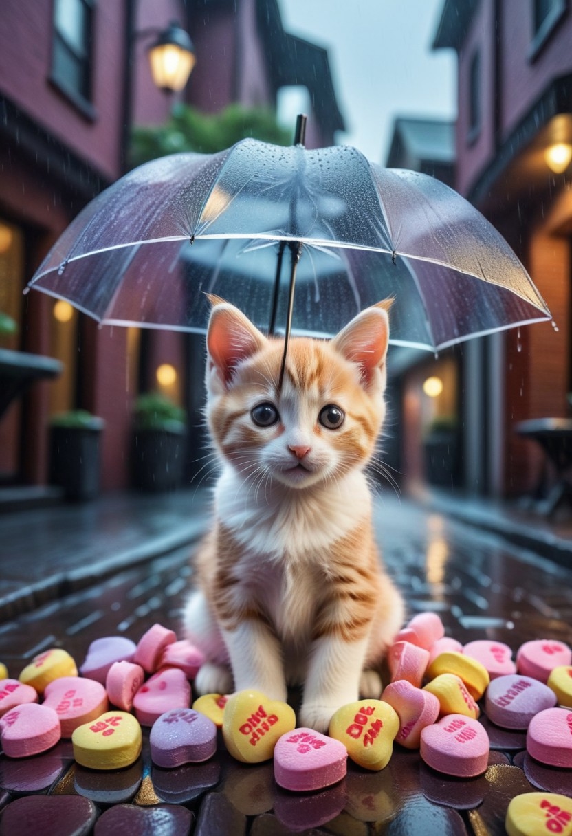 score_9, score_8_up, score_7_up, masterpiece-level, highly detailed, fantasy-themed, cute animal focus, really cute animal, cute focus, intricate details, vibrant and hilariously relaxed aesthetics, (rain made from candyhearts,:1.5) , (raindrops made from candyhearts,:1.5) text holding, umbrella:2, raining, kitten:2, kneeling, photorealistic render with Warframe aesthetic, dramatic lighting, best quality, plastic umbrella, (raindrops made from candyhearts:1.5)visible to shelter protecting a tiny, shivering calico kitten kitten nestled in a dark, atmospheric alleyway between high-tech buildings, (rain made from candyhearts:1.5) pouring down dramatic nighttime lighting, illuminated primarily by streetlights and the focusing on the kitten huddled safely, cute kitten, protection, rainy night, umbrella, juxtaposition, touching moment, sci-fi elegance, masterpiece, best quality, best quality, absurdres, 8k, HDR, <lora:albrecht_labs:1>
