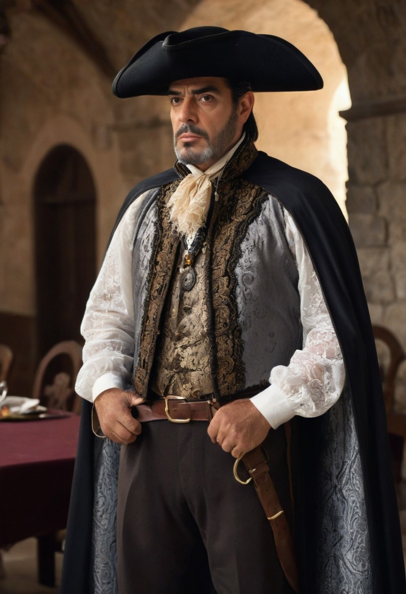 full shot of Juan Sanchez Villa-Lobos Ramirez, Overall appearance: Imposing, elegant, and distinguished. He always carries himself with confidence and refinement. Hair: Long and dark (sometimes streaked with gray), usually slicked back. Face: Strong features, with a well-groomed beard or clean-shaven depending on the scene. His eyes are intense, reflecting wisdom and experience. Clothing: He wears extravagant, exotic garments for his setting—luxurious capes, lace shirts, embroidered vests, and feathered hats—showcasing his refined style and well-traveled nature. Style: He blends the air of a Spanish nobleman from the Golden Age with the flair of a swashbuckling adventurer. He is (((looking at the viewer))), eye contact, the blurry backgrounds depicts a vaulted mediveal dining-hall with fieldstone walls