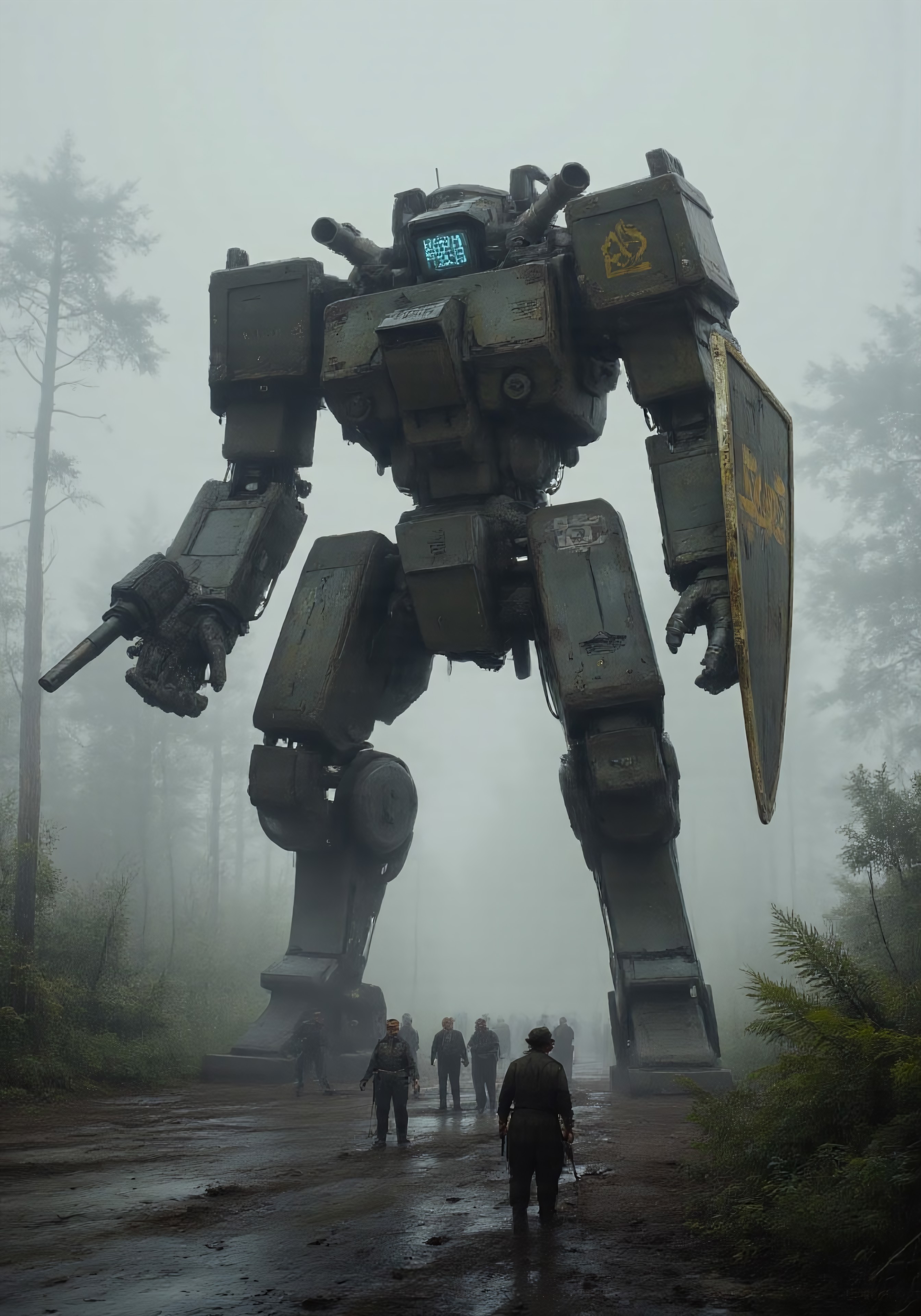 Brutalist Steampunk, gothic fantasy, moody lighting, rusted metal tones, ash and ember palette. Grimmdark, darktale, machanical, scattered golden runes and cybernectic line decorate. (Digital illustration, cinematic side-shot, ultra-realistic, foggy post-apocalyptic landscape) Side view, dutch angle, the Vanguard-class Titan, stands solemn and towering in a fog-drenched battlefield, massive autocannon and shield radiate divine menace, massive weapon systems integrated with cybernetic rune circuits. Its armor is scratched and battle-worn, painted with military green tones and the white “Knight Titan”, "T-4863" marking across its chassis. (Heavy industrial frame, glowing blue optic, hydraulic limbs, grounded military design). A group of human soldiers, dwarfed by its scale, advances cautiously in front, weapons ready. (Foreground: muddy, rain jungle with shrub, ferns; Background: giant rain Jungles tree, ferns, still water reflecting gray skies). A soldiers stands watchfully near the edge of the frame, heightening the sense of unease. (Muted palette, thick fog, somber tension, grounded sci-fi realism, narrative composition, high cinematic atmosphere)