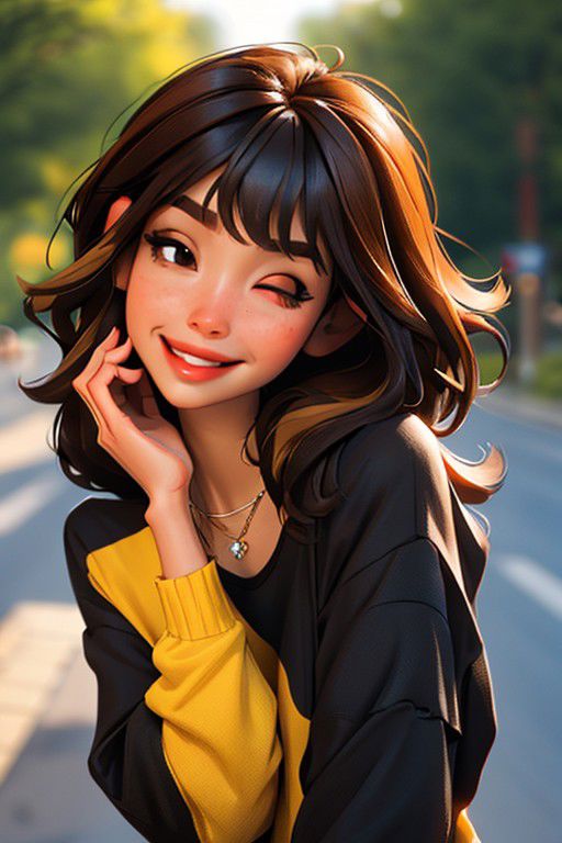 sam yang, 1girl, bangs, black hair, black shirt, blurry, blurry background, bokeh, brown eyes, brown hair, closed mouth, day, depth of field, hair between eyes, half-closed eyes, head tilt, jewelry, lips, long hair, long sleeves, looking at viewer, multicolored hair, necklace, nose, outdoors, shirt, smile, solo, thick eyebrows, two-tone hair, upper body , ((masterpiece)) <lora:sam_yang_offset:1>