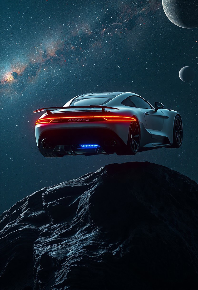 Mercedes-AMG ONE GT floating in outer space, ultra-realistic 4K render with high detail. The car has a pitch black and white color scheme, glowing red rear lights and neon blue front headlights. The car is levitating above a rugged asteroid, without contact to the surface. It is illuminated by distant stars, galaxies, and cosmic dust, casting subtle reflections on its sleek surface. Deep space lighting, realistic shadows, and a cinematic sci-fi atmosphere. The background features a cosmic environment with stars, nebulae, and distant celestial bodies. Emphasis on photorealism, weightless suspension, and dramatic lighting that enhances the futuristic vibe