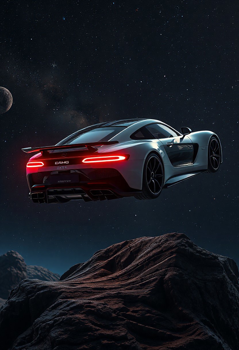 Mercedes-AMG ONE GT floating in outer space, ultra-realistic 4K render with high detail. The car has a pitch black and white color scheme, glowing red rear lights and neon blue front headlights. The car is levitating above a rugged asteroid, without contact to the surface. It is illuminated by distant stars, galaxies, and cosmic dust, casting subtle reflections on its sleek surface. Deep space lighting, realistic shadows, and a cinematic sci-fi atmosphere. The background features a cosmic environment with stars, nebulae, and distant celestial bodies. Emphasis on photorealism, weightless suspension, and dramatic lighting that enhances the futuristic vibe