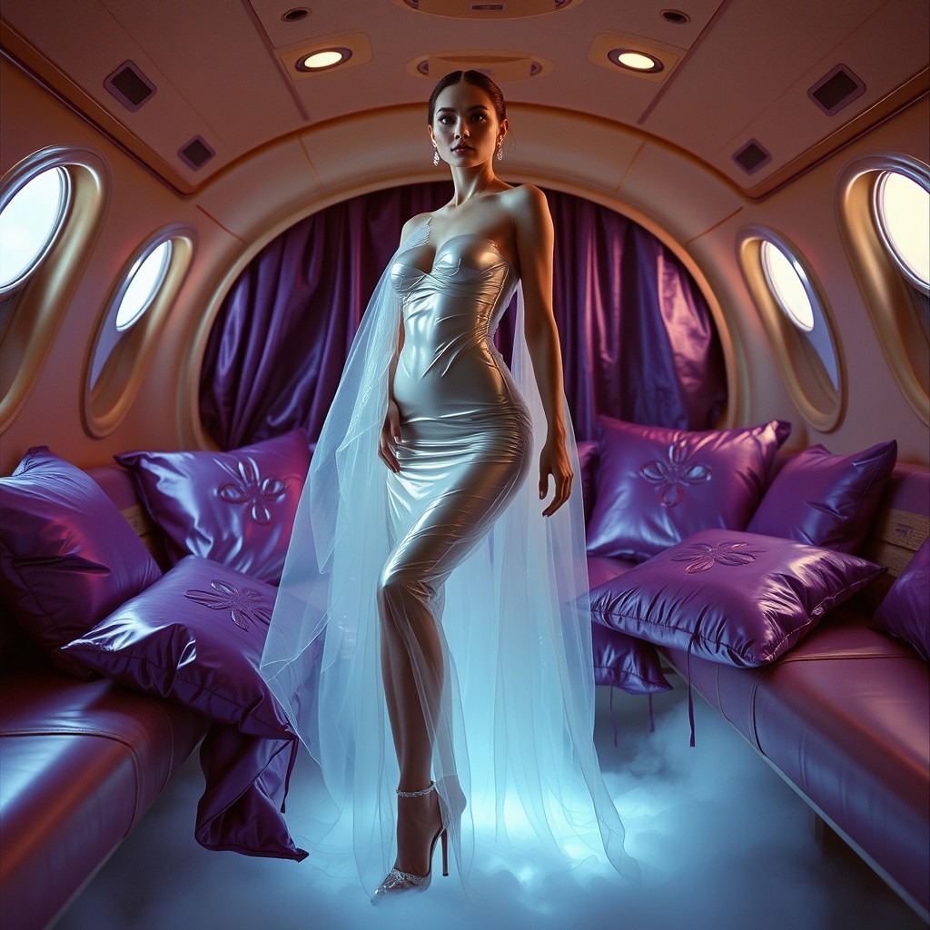 A poised and elegant slender lady, locked in a sleek, floor-length transparent slime dress, full skirt made of a giant glossy transparent jellyfish, complete with crystal-encrusted high heels, transparent slime cloak, is situated within a spaceship boudoir cabin, surrounded by weird foil purple pillows, fog from the floor, horror, soace, aliens, slime curtains, encased, entrapped Cinematic film still, shot on v-raptor XL, film grain, vignette, color graded, post-processed, cinematic lighting, 35mm film, live-action, best quality, atmospheric, a masterpiece, epic, stunning, dramatic