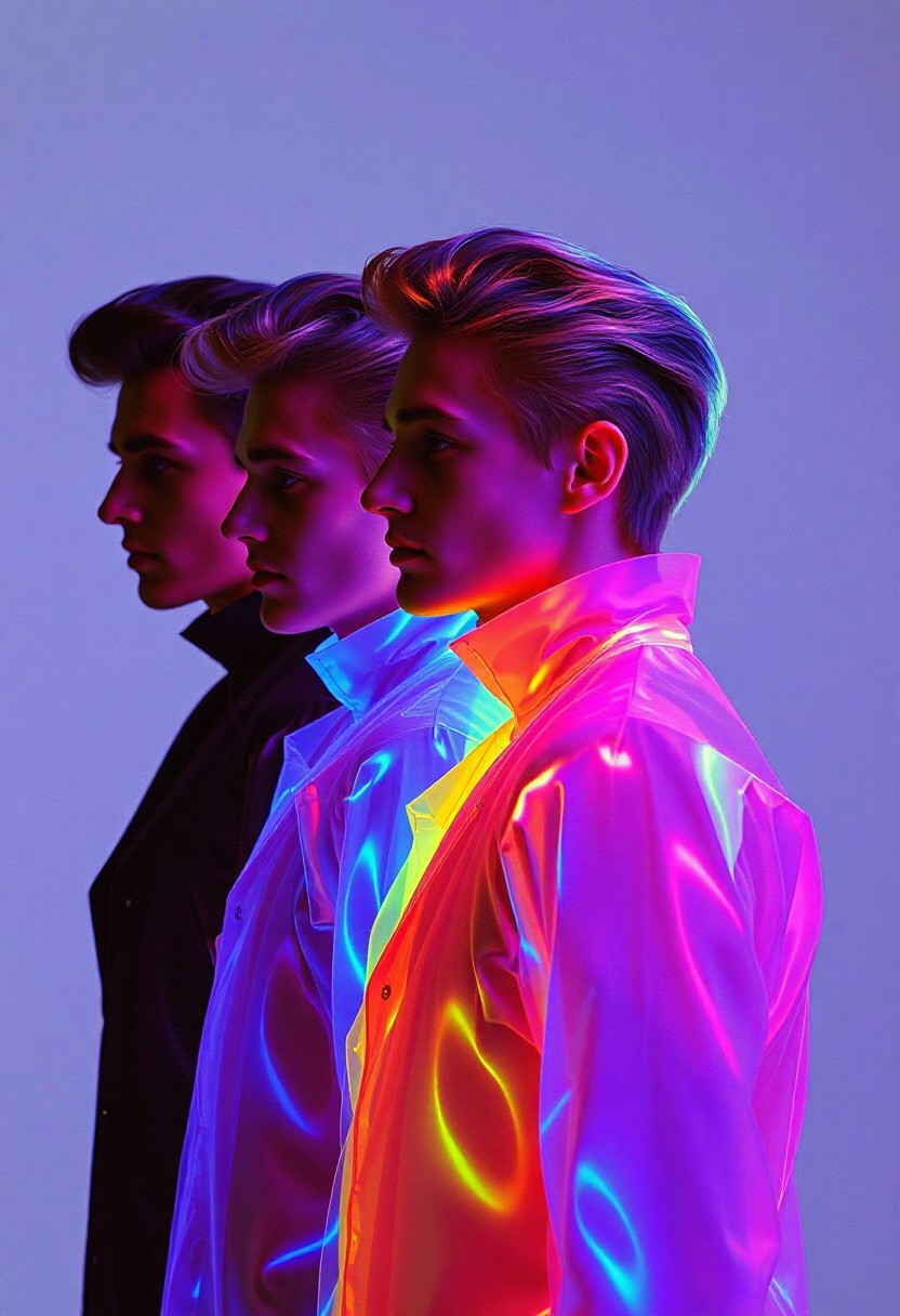 4 Caucasian Male models , all identical but in different stances , crystallisation, schizophernia, bioluminescent Jem the Hologram, surreal psychedelic flowing avant-garde art by Yoh Nagao and Erik Madigan Heck and Alan Aldridge, 1980's new wave totally radical fashion.,side view, side eye,