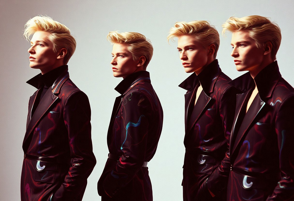 4 Caucasian Male models , all identical but in different stances , crystallisation, schizophernia, bioluminescent Jem the Hologram, surreal psychedelic flowing avant-garde art by Yoh Nagao and Erik Madigan Heck and Alan Aldridge, 1980's new wave totally radical fashion.,side view, side eye,