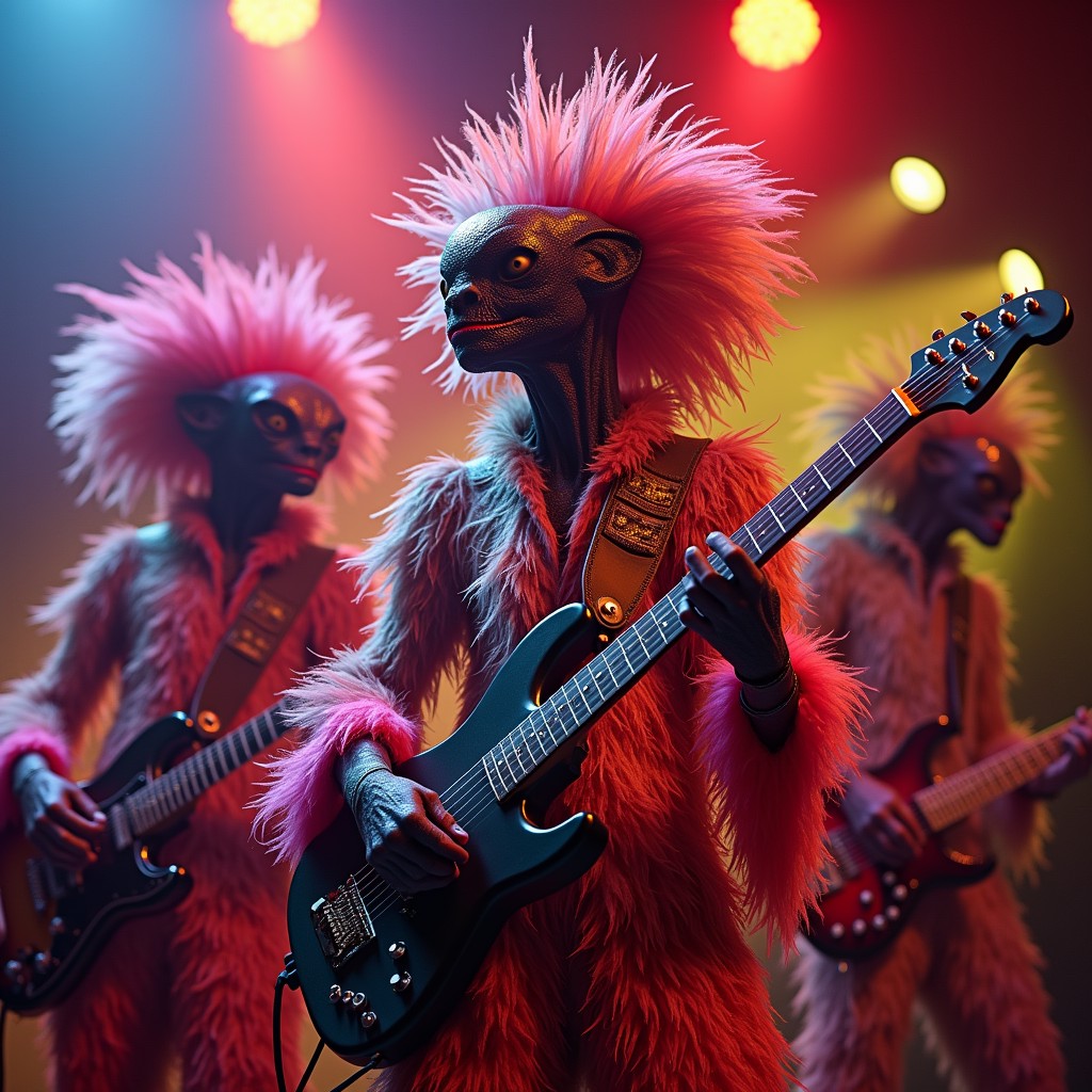 bizarre alien creatures covered in multi-colored feathers performing on stage as a rock band in a alien night-club, photo