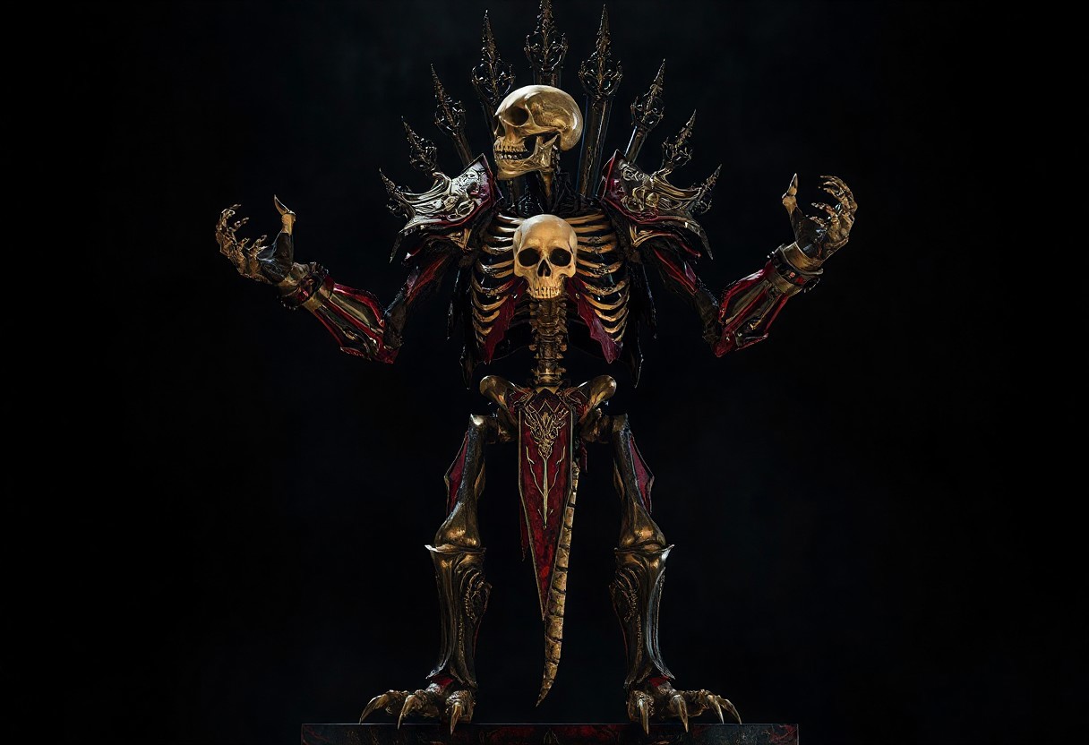 "A hyperdetailed cinematic concept art of a grimdark monster humanoid standing tall against a Nightmare Throne black background. The figure is composed of a skeletal structure, adorned with intricately designed red and gold armor covering its torso and arms, featuring a prominent skull on the chest. The monster’s arms are outstretched, legs slightly spread, and head turned to the left, gazing into the distance, exuding readiness and eerie dominance. Rendered in Unreal Engine 5, with 8K resolution, lifelike details, sharp lines, and stunning, harmonious colors. The composition is impeccable, with captivating lighting, balanced editing, and a creative angle, trending on ArtStation, CGSociety, and Pixiv. Inspired by the styles of Raphael, Houdini, and Grammer Effect, with vivid emotions and a powerful message. The monster humanoid’s design showcases handcrafted precision and a sense of otherworldly menace, making it the undeniable focal point of the image. Cinematic composition, featured on ArtStationHQ and Pixiv, evoking a high-stakes, dark fantasy atmosphere."