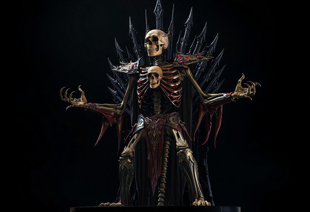 "A hyperdetailed cinematic concept art of a grimdark monster humanoid standing tall against a Nightmare Throne black background. The figure is composed of a skeletal structure, adorned with intricately designed red and gold armor covering its torso and arms, featuring a prominent skull on the chest. The monster’s arms are outstretched, legs slightly spread, and head turned to the left, gazing into the distance, exuding readiness and eerie dominance. Rendered in Unreal Engine 5, with 8K resolution, lifelike details, sharp lines, and stunning, harmonious colors. The composition is impeccable, with captivating lighting, balanced editing, and a creative angle, trending on ArtStation, CGSociety, and Pixiv. Inspired by the styles of Raphael, Houdini, and Grammer Effect, with vivid emotions and a powerful message. The monster humanoid’s design showcases handcrafted precision and a sense of otherworldly menace, making it the undeniable focal point of the image. Cinematic composition, featured on ArtStationHQ and Pixiv, evoking a high-stakes, dark fantasy atmosphere."