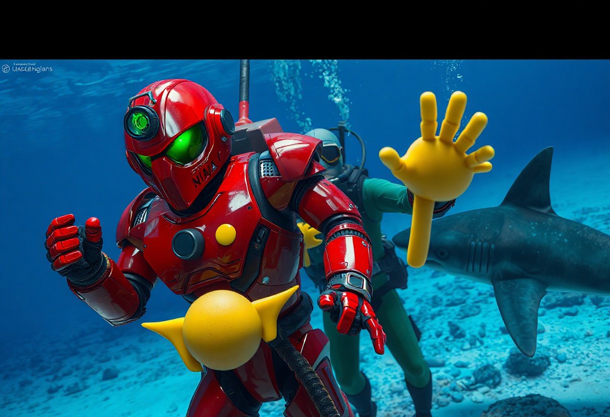 "A hyperdetailed cinematic underwater scene featuring three dynamic characters. In the foreground, a vibrant red Aqua Armor Ninja robot stands out, equipped with a large headlight and a smaller one on its chest, exuding readiness for an underwater adventure. It holds a yellow Cannonball Spear Shellfish, adding a playful element. In the middle, a scuba diver in a green wetsuit mirrors the robot’s action, also holding a yellow Cannonball Spear Shellfish, creating balance and focus. In the background, a grimdark Spider Shark swims, adding movement and dynamism to the scene. The blue watercolor Deep Sea backdrop provides a realistic underwater setting, enhancing the visual appeal. Rendered in Octane and Unreal Engine 5, with 4K resolution, lifelike details, sharp lines, and stunning, harmonious colors. The composition is impeccable, with captivating lighting, balanced editing, and a creative angle, trending on ArtStation, CGSociety, and ArtStationHQ. Inspired by the styles of Raphael, Houdini, and Grammer Effect, with vivid emotions and a powerful message. The scene evokes a playful yet adventurous underwater narrative, showcasing handcrafted precision and a sense of imaginative storytelling."