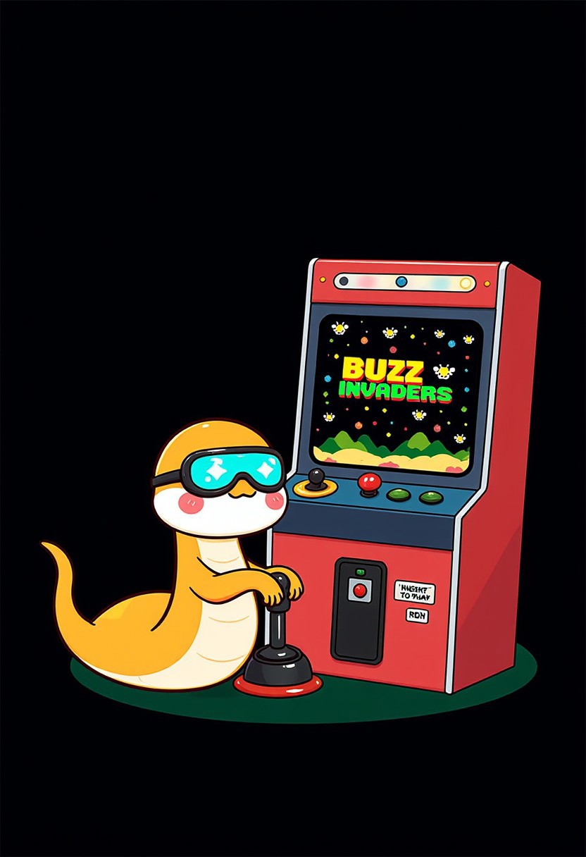 furry art, photorealistic digital art, Stationary Background, aidmatextimprover A playful cartoon snake baby coiled around a joystick, sitting in front of a retro arcade machine. The screen displays a game titled “Buzz Invaders” with pixelated bees flying across the screen. The snake wears gamer goggles with a slight green glow, and there’s a tiny coin slot on the machine with a sticker that reads, “Insert Buzz to Play.” The setting is simple, with just the arcade and glowing game screen in focus.