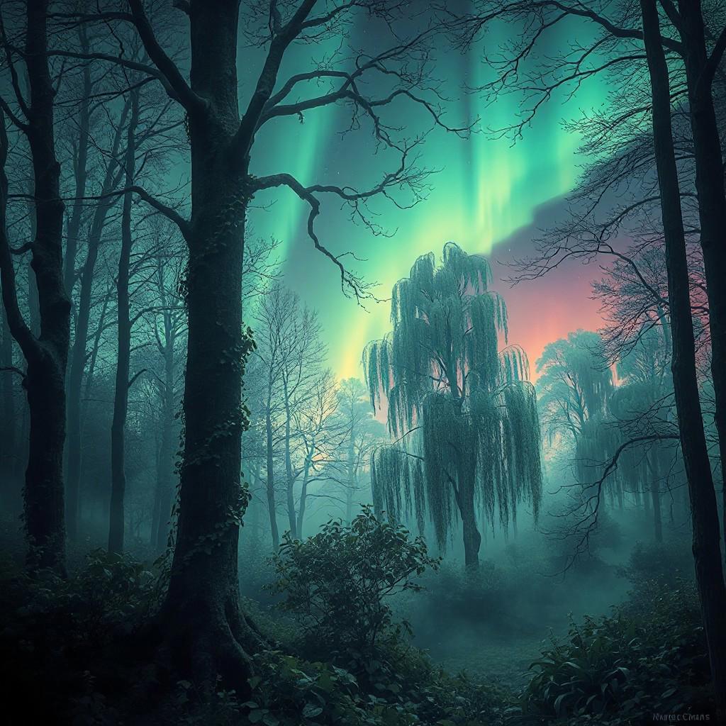 Auroral Copse – Dreamy, ethereal woods with aurora-like light filtering through mist, extremely detailed, vines climbing trees, weeping willow trees, bushes, brillant auroras in the sky