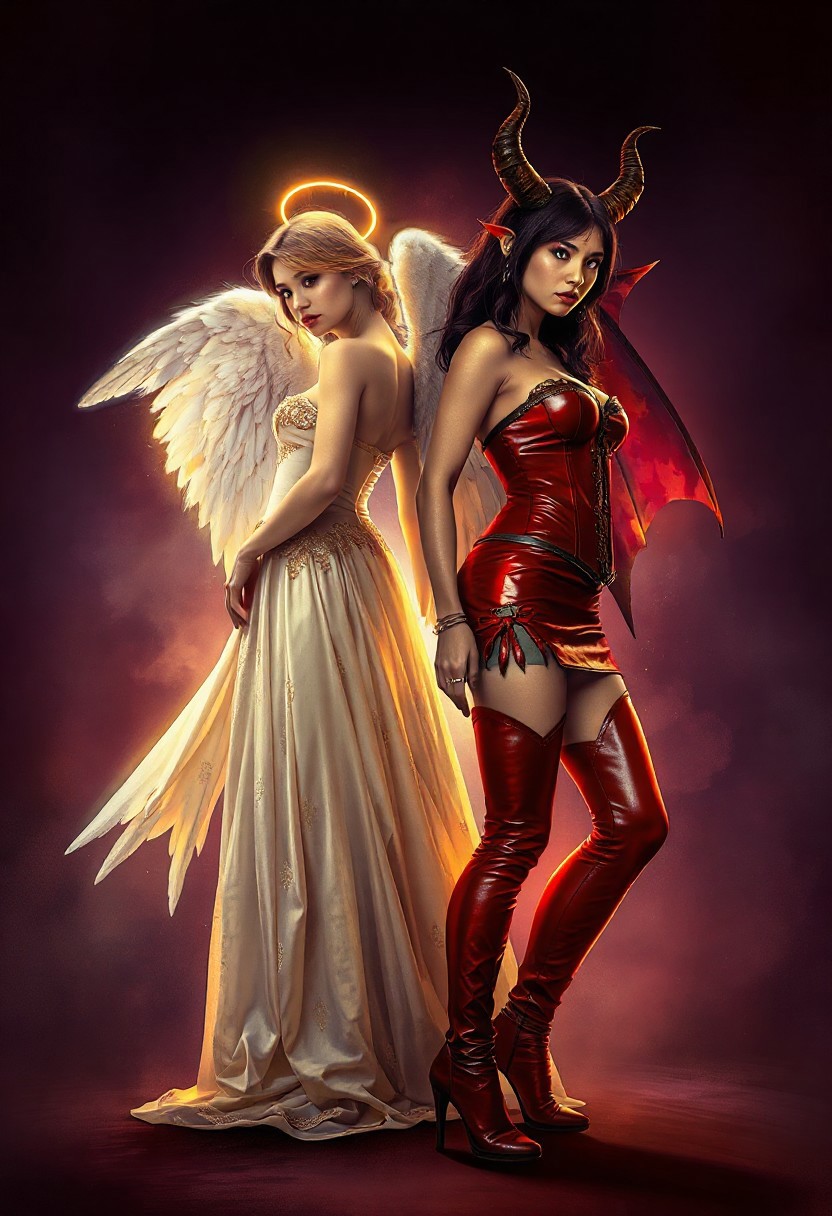 A stylized movie poster featuring an angel and a succubus standing back-to-back. The angel, facing the viewer, wears a flowing ivory gown with gold filigree, a radiant halo, and feathered wings emitting divine light. Her serene beauty is emphasized by soft, celestial glow. The succubus, turned away, exudes temptation—dressed in a glossy red latex corset, thigh-high boots, and a jagged leather skirt. Her smoldering eyes, dark horns, and glowing infernal wings radiate seductive energy. The lighting contrasts virtue and desire, with ethereal gold against moody purples and reds, creating a dramatic, painterly composition.