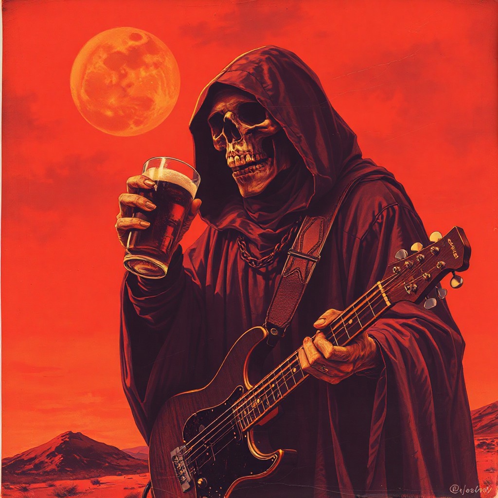 Dark art of an cloaked ominous monk from the 70s-style pulp paintings drinking a beer while holding a electric guitar hanging around his nick with a guitar strap, The sky is red and otherworldy. The monks grinning skeletal face is barely visible. Duotone: Burnt orange and deep plum. Mood: Occult ritual meets 80's crinkled concertposter art style. Grim reaper, doom metal-style, gritty, desert ritual, tales from the crypt