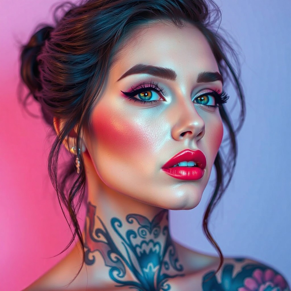 A beautiful woman in blue and pink, in the style of tattoo — inspired, kawaii aesthetic, kelly sue deconnick, light pink and dark amber, distinctive noses, tanya shatseva, uhd image