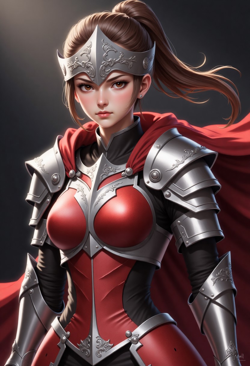 Female Commander (Silver & Red Armor), arduino, masterpiece, rotk_style, portrait, solo, upper body, female warrior, fierce gaze, ponytail, silver and red armor, crimson cape, ornate pauldrons, battlefield lighting, dramatic tone, cg_style, by kittew and themaestronoob, rotk_style, female, commander, silver_red_armor, cape, portrait, cg_style