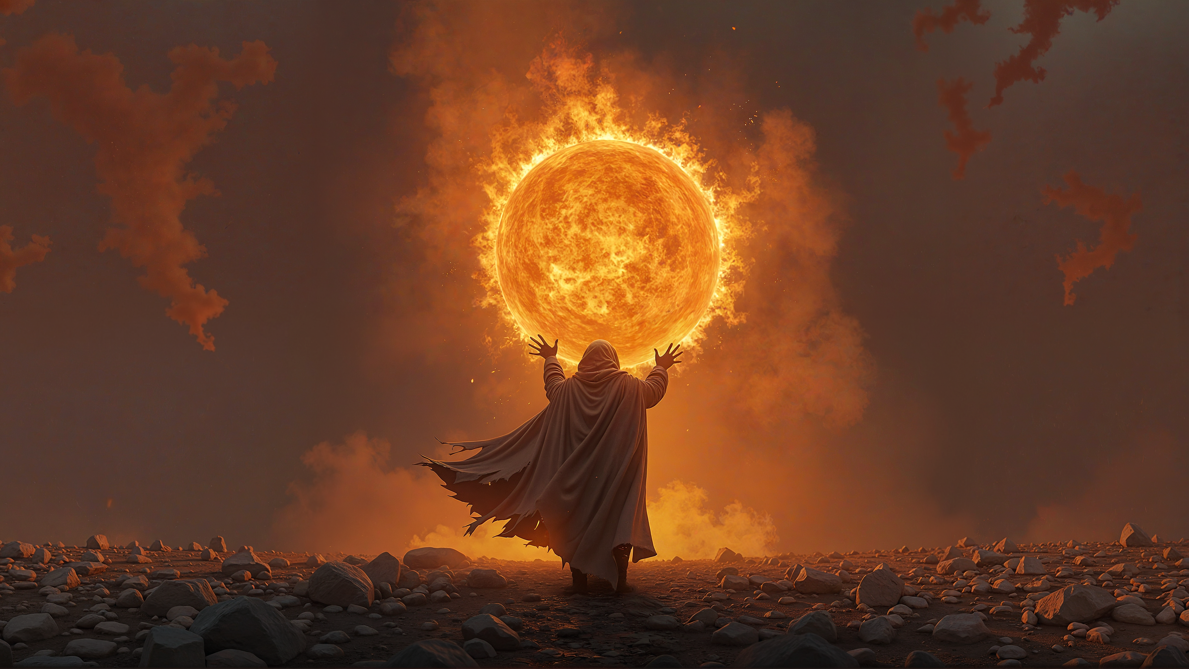 fantasy artwork depicting a dramatic, mystical scene. The central figure is a hooded, robed figure, a sorcerer , standing in a barren, rocky landscape. Many small rocks and stones on the ground. The figure is dressed in a flowing, rugged and damaged dark cloak billowing dramatically in the wind. The hood is drawn, obscuring his head, adding to the mysterious atmosphere. Backview, we see the sorerer from the back. He is rising his hands up. A ball of fire in the middle, a fireball. Smoke everywhere and ashes falling from the sky. intricate details, 4k, highres, best quality, dramatic, cinematic, epic, concept art, digital art, realistic, professional masterpiece, dynamic. No fire on the ground. Casting a symmetric shadow in the middle. Shadows.