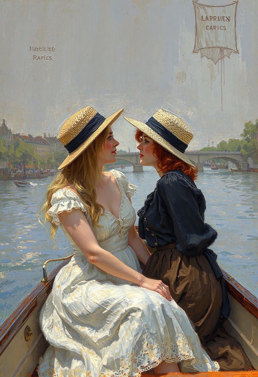 lesbian lovers in a boat on the Seine, 19th century Paris, in the Impressionist style of Renoir, blonde, brunette, copper hair, French boater hat, English boater hat, slim, full figure, 18yo, 35yo, dress, blouse and skirt