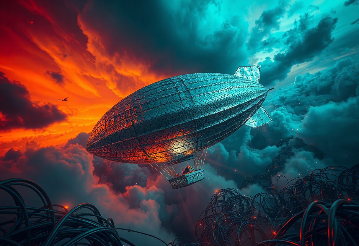 masterpiece, ultra-detailed, dutch angle view of a trippy zeppelin drifting through tangled circuits, metalic-scale patterns glowing , silver colors, dark-orange sky background, misty clouds, electric stormlight