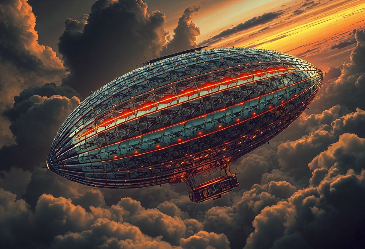 masterpiece, ultra-detailed, dutch angle view of a trippy zeppelin drifting through tangled circuits and misty clouds, metalic-scale patterns glowing under electric stormlight, silver colors, dark-orange sky background