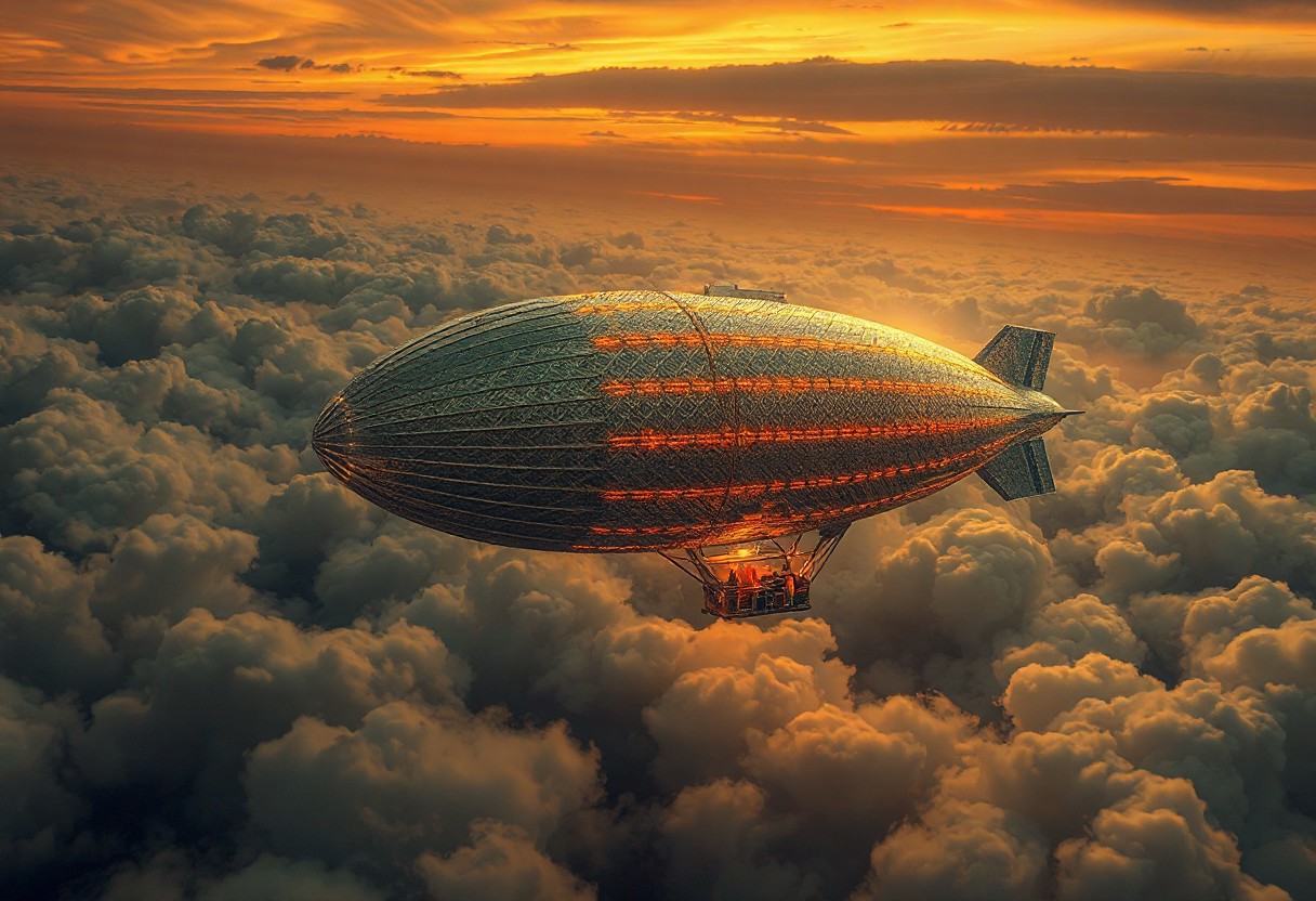 masterpiece, ultra-detailed, dutch angle view of a trippy zeppelin drifting through tangled circuits and misty clouds, metalic-scale patterns glowing under electric stormlight, silver colors, dark-orange sky background