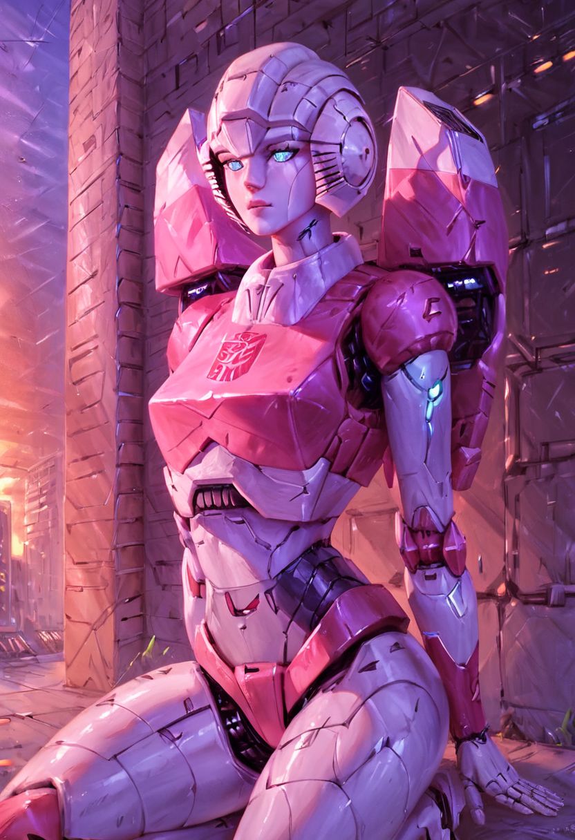 score_9, score_8_up, score_7_up,score_6_up, perfect face, perfect anatomy, rating_questionable, Expressiveh, sci-fi, futuristic, neon, city, outdoors, sunset, arcee, transformers, robot, robot, mecha, autobot, 1girl, solo, 28 year old girl, robot girl, mechanical parts, very white skin, sexy pose, cute pose, pouting, mischievous eyes, kneeling on edge of building