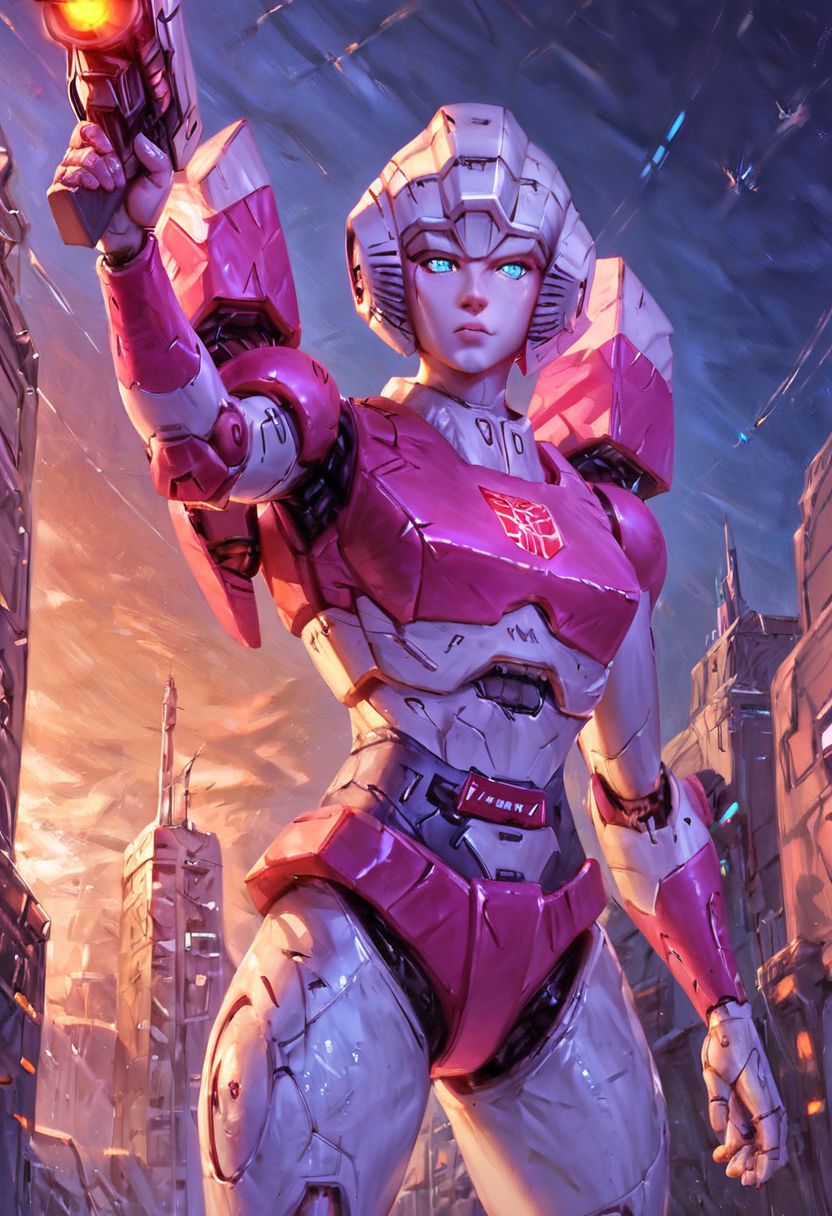 score_9, score_8_up, score_7_up,score_6_up, perfect face, perfect anatomy, rating_questionable, Expressiveh, sci-fi, futuristic, neon, city, outdoors, sunset, arcee, transformers, robot, robot, mecha, autobot, 1girl, solo, 28 year old girl, very white skin, holding laser gun, sexy pose, cute pose, pouting, mischievous eyes