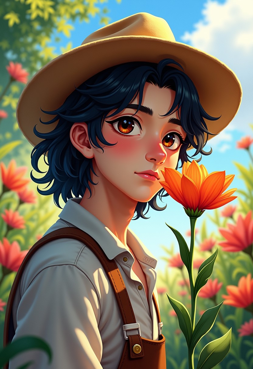 Highly detailed digital art of 1 male, solo, beautiful masculinity, half asian, long wavy black hair, brown eyes, kind eyes, gardener, groundskeeper, wide brim straw hat, lush garden, colorful flowers, dappled sunlight, best quality, nature, surreal, impressionism, gorgeous flower by his face