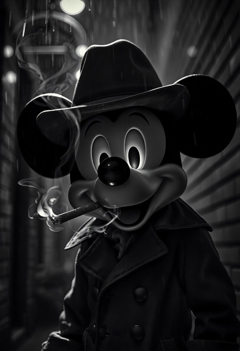 Close-up portrait of Mickey Mouse reimagined in noir style, wearing a vintage trench coat and fedora hat, standing under rain in a dimly lit alley. A lit cigar in his mouth releases swirling smoke around his face. His glowing eyes shine from under the hat's brim. Strong shadows create a moody, dramatic contrast. Black and white, cinematic lighting, f/2.8, ultra-realistic textures, gritty and mysterious atmosphere, film still look.